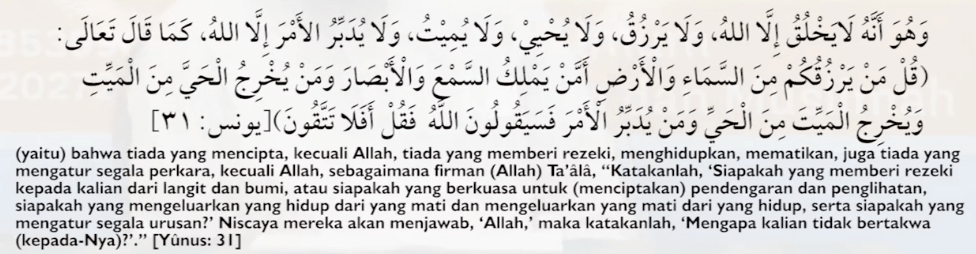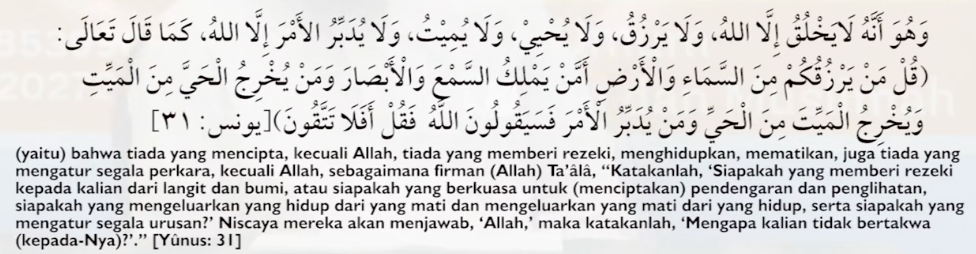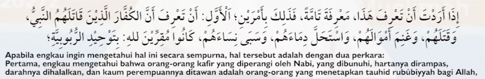 Engkau mengetahui bahwa orang-orang kafir yang diperangi oleh Nabi, yang dibunuhi, hartanya dirampas, darahnya dihalalkan, dan kaum perempuannya ditawan adalah orang-orang yang menetapkan tauhid rububiyyah bagi Allah. Apa itu Tauhid rububiyyah yaitu tiada yang mencipta kecuali Allah, tiada yang memberi rezeki, menghidupkan, mematikan, juga tiada yang mengatur segala perkara kecuali Allah.