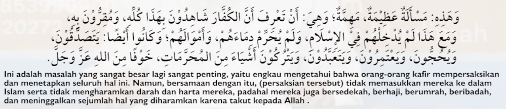 Ini adalah masalah yang sangat besar lagi sangat penting, yaitu engkau mengetahui bahwa orang-orang kafir mempersaksikan dan menetapkan seluruh hal ini. Namun, bersamaan dengan itu (persaksian tersebut) tidak memasukan mereka ke dalam Islam serta tidak mengharamkan darah dan harta mereka, padahal mereka juga bersedekah, berhaji, berumrah, beribadah dan meninggalkan sejumlah hal yang diharamkan karena takut kepada Allah.
