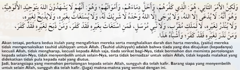 Perkara kedua inilah yang mengafirkan mereka serta menghalalkan darah dan harta mereka, (yaitu) mereka tidak mempersaksikan tauhid uluhiyyah untuk Allah. Tauhid uluhiyyah adalah bahwa tiada yang doa ditujukan (kepadanya) kecuali Allah, tidak mengharap, kecuali kepada Allah saja, tiada serikat bagi-Nya, tidak bermohon dan meminta pertolongan kepada selain-Nya, tidak menyembelih untuk selain-Nya, serta tidak bernadzar untuk selain Allah, tidak kepada malaikat yang didekatkan tidak pula kepada nabi yang diutus.