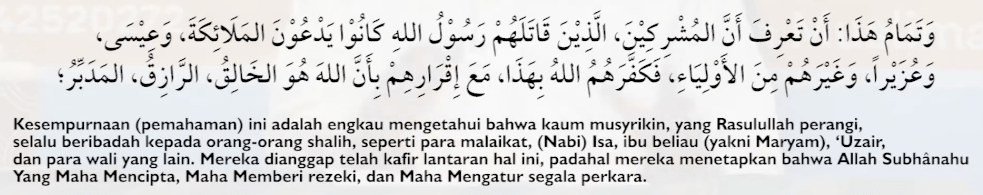 Kesempurnaan (pemahaman) ini adalah engkau mengetahui bahwa kaum musyirikin, yang Rasulullah perangi, selalu beribadah kepada orang-orang shalih, seperti para malaikat, (Nabi) Isya, ibu beliau (yakni Maryam), ‘Uzair, dan para wali lainnya. Mereka dianggap telah kafir lantaran hal ini, padahal mereka menetapkan Allah Subhanahu Yang Maha Mencipta, Maha Memberi rezeki, dan Maha Mengatur segala perkara.
