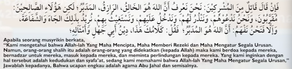 Apabila seorang musyirikin berkata, “Kami mengetahui Allah-lah Yang Mencipta, Maha Memberi Rezeki dan Maha Mengatur Segala Urusan. Namun, orang-orang shalih itu adalah orang-orang yang didekatkan (kepada Allah) maka kami berdoa kepada mereka, bernadzar untuk mereka, masuk kepada mereka dan meminta perlidungan kepada mereka. Yang kami inginkan dengan hal tersebut adalah kedudukan dan syafa’at, sedang kami memahami bahwa Allah-lah Yang Maha Mengatur Segala Urusan”. Jawablah kepadanya, Bahwa ucapan engkau adalah agama Abu Jahal dan semisalnya.