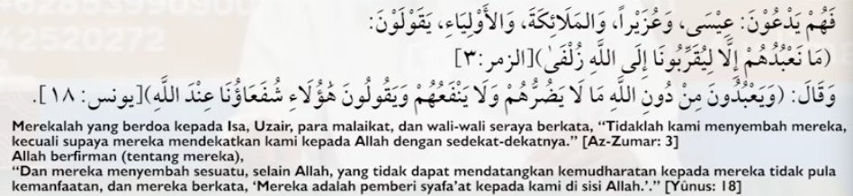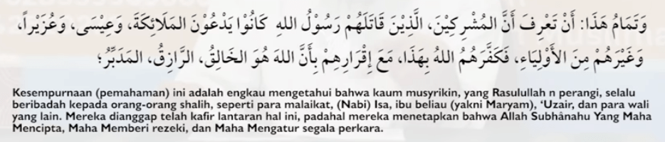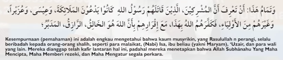 Kesempurnaan (pemahaman) ini adalah engkau mengetahui bahwa kaum musyirikin, yang Rasulullah perangi, selalu beribadah kepada orang-orang shalih, seperti malaikat, (Nabi) Isa, ibu beliau (yakni Maryam), ‘Uzair, dan para wali yang lain. Mereka dianggap telah kafir lantaran hal ini, padahal mereka menetapkan bahwa Allah Subhanahu Yang Maha Mencipta, Maha Memberi Rezeki, dan Maha Mengatur segala perkara.