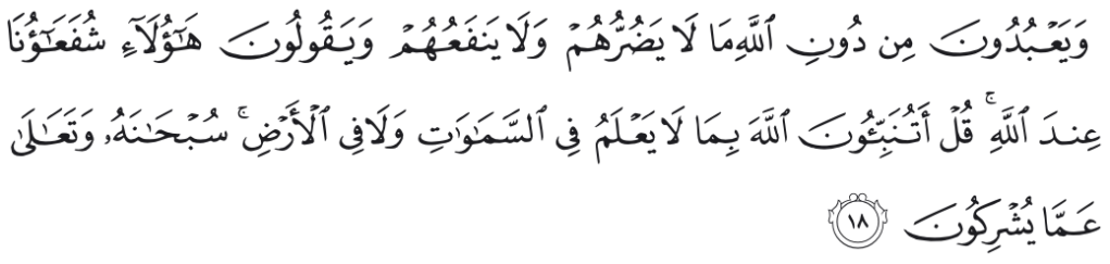 Dan mereka menyembah sesuatu, selain Allah, yang tidak dapat mendatangkan kemudharatan kepada mereka tidak pula kemanfaatan, dan mereka berkata “Mereka adalah pemberi syafa’at kepada kami di sisi Allah”.