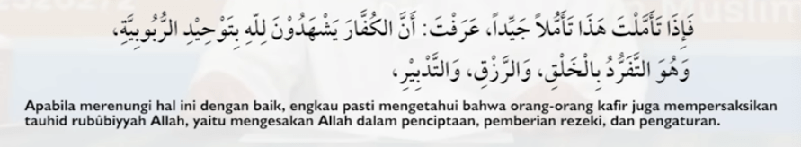 Apabila merenungi hal ini dengan baik, engkau pasti mengetahui bahwa orang-orang kafir juga mempersaksikan tauhid rububiyyah Allah, yaitu menegaskan Allah penciptaan, pemberian rezeki dan pengaturan.