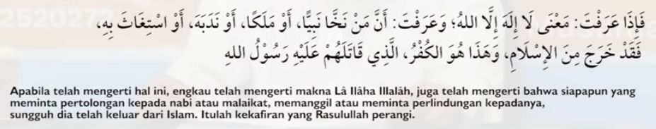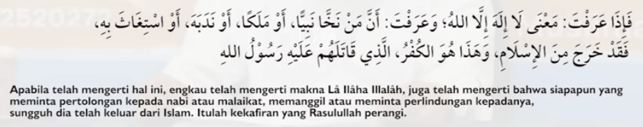 Apabila telah mengetahui hal ini, engkau telah mengerti makna La Ilaha Illallah, juga mengerti bahwa siapapun yang meminta pertolongan kepada nabi atau malaikat, memanggil atau meminta perlindungan kepadanya, sungguh dia telah keluar dari Islam. Itulah kekafiran yang Rasululullah perangi.