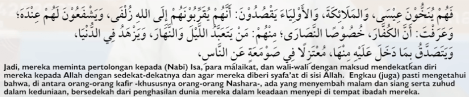 Jadi mereka meminta pertolongan kepada (Nabi) Isa, para malaikat dan wali-wali dengan maksud mendekatkan diri mereka kepada Allah, dengan sedekat-dekatnya dan agar mereka diberi syafaat di sisi Allah. Engka (juga) pasti mengetahui bahwa, di antara orang-orang kafir -khususnya orang-orang Nashara- ada yang menyembah malam dan siang serta zuhud dalam keduniaan, bersedekah dari penghasilan dunia mereka dalam keadaan menyepi ditempat ibadah mereka.