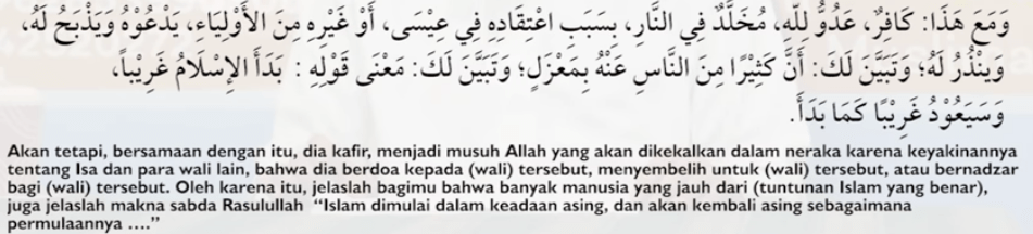 Selanjutnya kita ketahui bahwa orang-orang kafir khususnya nashara ada yang beribadah malam dan siang, zuhud di dunia, bersedekah dengan penghasilan mereka dalam keaadaan menyepi ditempat ibadahnya. Walaupun demikian mereka ini Kafir, musuh Allah dan akan kekal dalam mereka. Dikarenakan keyakin mereka tentang nabi Isya dan para wali yang lainnya. DImana mereka berdoa kepada wali tersebut, menyembelih untuk wali tersebut dan bernadzar kepada nya. Untuk itu jelaslah bagimu, bahwa banyak manusia jauh dari tuntutan islam yang benar. Jelaslah sabda rosulullah “Islam dimulai dalam keadaan asing, dan akan kembali asing sebagaimana permulannya”.