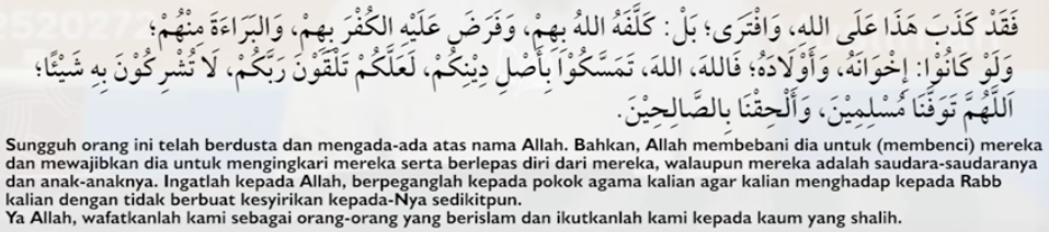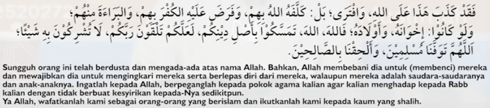 - Kafirlah kalian kepada thogut, musuhi mereka, dan benci kepada siapa yang mencintai mereka. Walaupun mereka adalah saudara-saudaranya dan anak-anaknya. Harus ada benci kepada orang kafir, berlepas diri dari mereka, dan meyakin mereka adalah penduduk neraka kalo mati dalam kekafiran. Adapun masalah hidup dalam sebuah negeri, dijaga negeri itu, tidak mendholomi, walaupun berbeda agama. Itu ada aturan dalam agama kita. bukan hal yang dilarang, ada tuntutnan dan syariatnya tapi bukan berearti kita cinta kepada mereka, kita membenarkan agama mereka. Ini harus dibedakan.