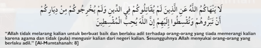 “Sesungghunya Allah tidak melarang kalian untuk berbuat baik, terhadap orang yang tidak memerangi kalian dan tidak mengusir kalian dari negeri-negeri kalian”