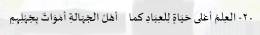 Al Ilmu A’la hayatin: ilmu adalah kehidupan yang paling tinggi. Lil’ibadi, untuk segenap hamba. Kama, sebagaimana. Ahlul jahalah amwatul bijahilimi, orang-orang yang jahil, mereka itu sebenarnya mati dengan kejahilan mereka.