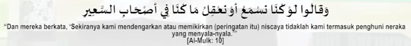 Firman Allah dalam surat Al-Mulk ayat 10, mengenai penyesalan penduduk neraka. Penyesalaan ini dimulai ketika keluar ruh keluar dari jasadnya, sakaratul maut, kemudian penyesalannya terus bertambah sampai mereka masuk neraka.