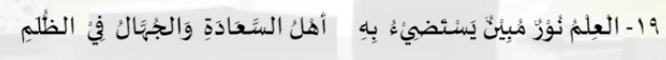 Al-Imu nuuru mubin, Ilmu adalah cahaya yang sangat terang. Yastadhiu bihi, yang dijadiksan sebagai lentera. Ahlu sa’adah, oleh orang yang beruntung. Wajuhalu fii dholami, sedangkan orang-orang yang jahil berada didalam kegelapan.