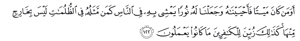 Apakah orang yang tadinya mayat, lalu dihidupkan, kami jadikan untuknya cahaya. Dia berjalan dengan cahaya itu ditengah manusia. Apakah sama orang yang seperti ini, dengan orang yang dalam kegelapan dan tidak mau keluar darinya?