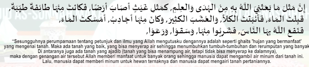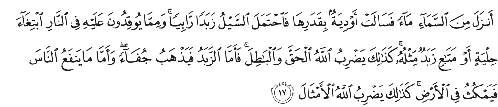 - Seperti Air yang diturnkan dari langit, yang memberi manfaat bagi kehidupan. Hati itu seperti lembah-lembah yang menampung air, ada yang besar bisa menampung banyak air, dan ada yang kecil hanya menampung sedikit air. Maka air mengalir sesuai dengan kadarnya, ada yang banyak ada yang sedikit tergantung lemahnya (hati). Maka arus dari air itu membawa buih yang mengambang. Apabila keindahan ilmu sudah menyentuh hati, maka ilmu akan mengeluarkan subhat-subhat hal-hal yang bathil dari hatinya. Seperti air mengalir kelembah, apabila ada kotoran jadi buih mengambang dan hilang.