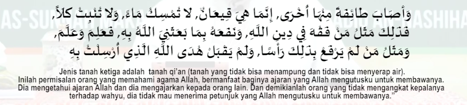 Tanah jenis ketiga yaitu tidak menampung dan tidak pula menahannya. Maka hanya mengalir saja melewatinya. Ini adalah perumpamaan orang yang memahami agama Allah, bermanfaat bagunta ajaran yang Allah mengutusku untuk membawanya. Dia mengetahui ajaran Allah dan dia mengajarkan kepada orang lain. Dan demikianlah yang tidak mengangkat kepalanya terhadap wahyu, dia tidak mau menerima petunjuk yang Allah mengutusku untuk membawanya.