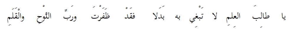 Wahai seorang penuntut ilmu, jangan kamu cari pengganti apapun untuk ilmu yang kamu cari itu. Sungguh engkau telah memperoleh keberhasilanmu, demi Allah (Rabb) yang memiliki lahul mahfudz dan pemilik Al-Qalam.