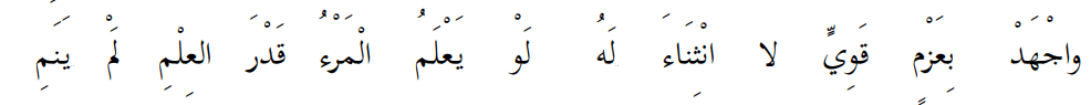 Dan bersungguh-sungguhlah kamu dengan azam yang kuat, tidak lemah dengannya. Andaikata seseorang mengenai kadar ilmu, dia tidak akan tidur.