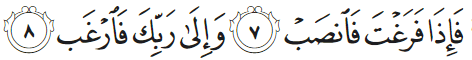 Apabila kamu telah selesai, Nabi Muhammad, berdiri lagi lakukan ibadah yang lainnya. Dan kepada Rabbmu hendaknya engkau selalu berharap.