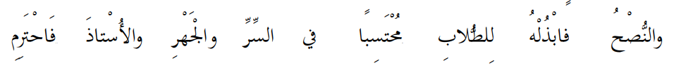 Nasihat hendaknya kamu berikan kepada para murid dengan mengharap pahala secara rahasia maupun terang-terangan. Dan terhadap ustadz hendaknya engkau memuliakannya.