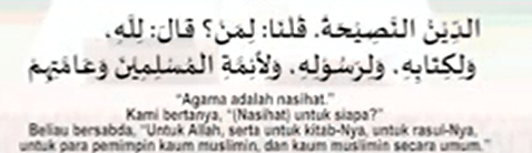 “Agama adalah Nasihat”, Nasihat bagi Allah, bagi kitab-Nya, bagi Rasul-Nya, bagi para Imam kaum muslimin, dan kaum muslimin secara umum. Maknanya tulus bagi Allah dengan melakukan hal yang paling baik meliputi melaksanakan segala perintah dan meninggalkan segala larangan-Nya, beriman dengan adanya Allah, Rububiyyah, Ulluhiyya, nama-nama dan sifat-Nya.