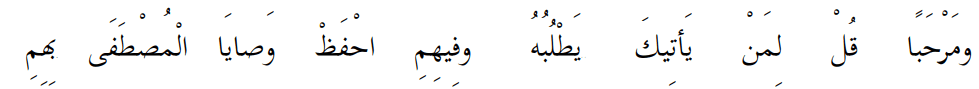 Bait Syair 65: Ucapkan selamat datang kepada orang yang datang kepadamu untuk menuntut ilmu … Hafalkan nasihat-nasihat Al-Mustafa shallallahu alaihi wasallam tentang hak penuntut ilmu.