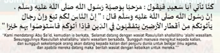 Sesungguhnya manusia mengikuti dibelakangannya dan sesungguhnya sekelompok orang mendatangi kalian dari penjuru bumi untuk belajar memahami ilmu agama. Apabila mereka datang pada kalian, maka berwasiatlah yang baik untuk mereka.