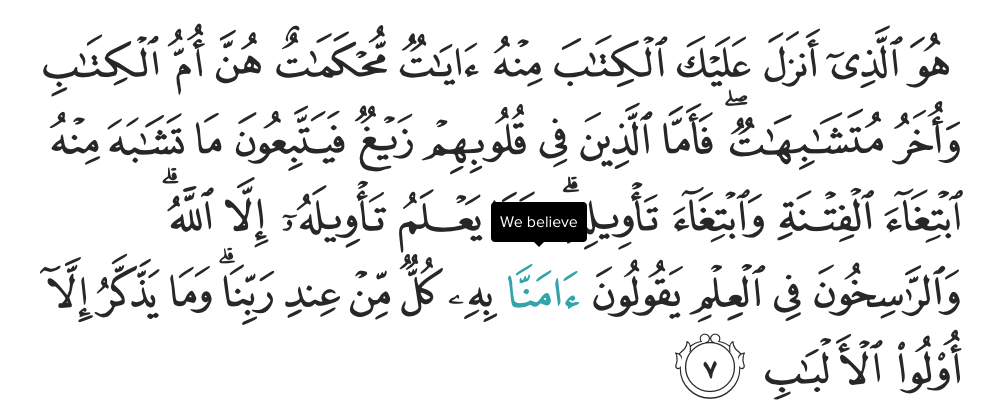 Sebagaimana firman Allah “Dia-lah Allah yang menurunkan Alkitab, yang tedapat ayat-ayat muhkamat yang merupakan pokok-pokok al-kitab. Dan yang lainnya mutasbih”