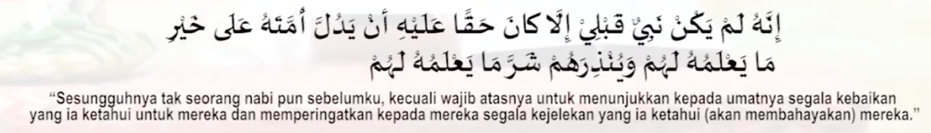 Tidak adaseorang nabi pun sebelumku, kecuali wajib atas nabi ini menjelaskan kepada umatnya segala kebaikan yang diketahui untuk mereka. Dan wajib menjelaskan segala kejelekan yang bisa membahayakan umatnya.