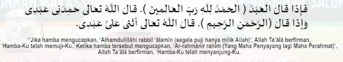 Jika hamba membaca “Alhamdulullahi rabbil ‘alamain“, Allah berfirman: “Hambaku telah memujiku. Kemudian hamba membaca “Arrahmannir rahim“, maka Allah berfirman: “Hambaku telah menyanjungku”.