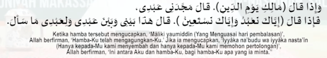 Jika hamba membaca “Maliki yaumiddin“, maka Allah berfirman “Hamba-Ku telah membesarkan-Ku”. Jika hamba mengucapkan “Iyyaka na’budu wa iyyaka nasta’in“, maka Allah berfirman “Ini antara aku dan hambaku, dan untuk hambaku apa yang dia minta”.