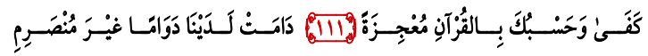 Telah sempurna dan cukup bagi engkau dengan Al-Qur’an sebagai mukjizat. Yang mukjizat ini kekal didunia yang tidak akan pernah sirna. Maksudnya Al-Qur’an ini adalah mukjizat tidak terputus, terus belanjut hingga hari kiamat. Mukjizat artinya sesuatu yang tidak dikalahkan dan tidak pula ada yang bisa mendatangkannya. Namun dalam bahasa Al-Qur’an tidak disebut mukjizat melainkan ayat, bayinat (kejelasan), Al-Huda (petunjuk-petunjuk). Namun maksud penulis adalah sama dalam pengertiannya, agar bisa dipahami orang-orang belakangan.