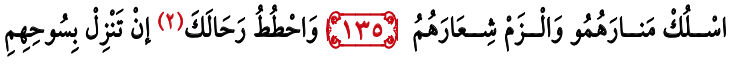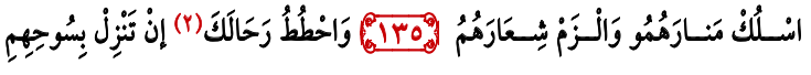Kamu hendaknya menempuh menarah (tanda/rambu) mereka, dan hendaknya kamu komitment dengan syiar mereka. Hendaknya kamu tambakan dari kendaran-kendaraan mu, letakan (ikatan) mereka, apabila kamu turun ditempat mereka.