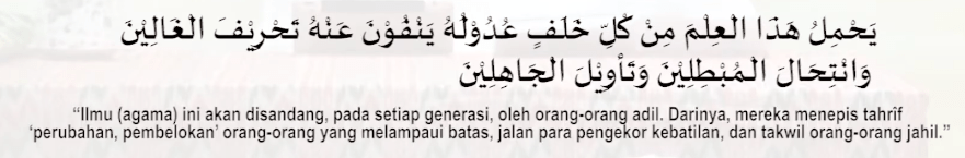 “Sesungguhnya ilmu ini disandang pada setiap generasi oleh orang-orang yang adil”. Ini penegasan bahwa ilmu agama tidak akan pernah surut, pasti akan ada yang menyandangnya, yaitu orang-orang yang adil (ahli hadist). Yaitu “mereka yang menafikan dari hadist perubahan yang dilakukan oleh orang-orang yang ekstrem, dan jalannya orang-orang ahlul bathil dan taqwil nya orang-orang jahil.”