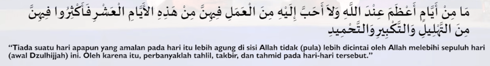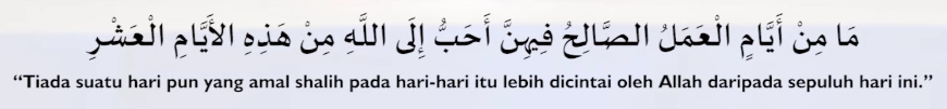 Dalam hadist yang lain redaksinya: tidak ada satu hari pun yang lebih agung dan lebih dicintai oleh Allah, beramal soleh didalamnya melebihi 10 hari pertama di Bulan Dzulhijjah.