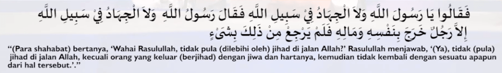 Apakah amalan Jihad dikalahkan oleh amalan 10 hari ini?, Nabi berkata, “iya, tidak pula dilebihi oleh Jihad fisabilillah. Kecuali kalau jihadnya orang yang keluar dengan jiwa dan hartanya, kemudian tidak kembali dengan suatu apapun. Artinya mati syahid.
