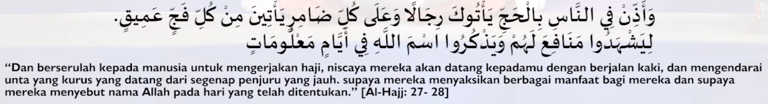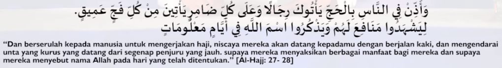 Umukan ibadah haji, maka mereka akan datang dengan berjalan kaki, mengendari unta yang kurus dari segala penjuru. Supaya mereka menyaksikan manfaat. Dan supaya berdzikir kepada Allah pada hari-hari yang telah ditentukan.
