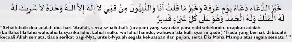 - Ucapan doa para nabi di hari Arafah: La Ilaha Illallahu Wahdahu la syarika lahu. Lahul mulku wa lahul hamdu, wahua ‘ala kulli syai in qadir.