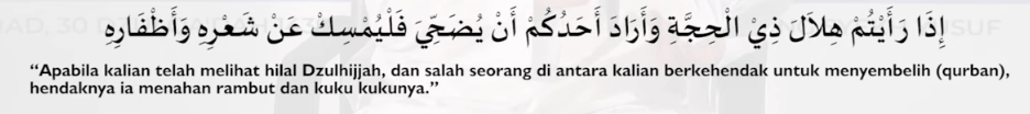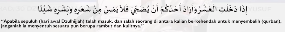 Ber qurban di tanggal 10 Dzulhijjah. Apabila berniat berqurban maka mulai tanggal 1 Dzulhijjah tidak boleh mencabut kulitnya, memotong rambut, dan memotong kuku.
