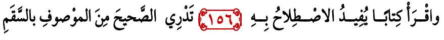 Syair 156: bacalah sebuah kitab mustolah (istilah seputar hadist). Dengan engkau membaca kitab ini, engkau akan mengetahui, mana hadist yang shahih dan hadist yang disifatkan dengan penyakit (dhoif).