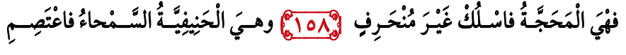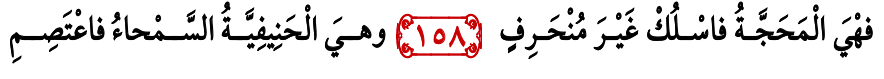 Syair 158: Sunnah itu adalah hujjah yang sangat jelas, maka ikutilah jalan tersebut tanpa menyimpang. Dan Sunnah juga adalah al-hanifiah, agama yang condong kepada tauhid dan meninggalkan kesyirikan. Dan dia juga As-Samha, mudah dan tidak menyulitkan. Hendaknya engkau berpegang dengannya.
