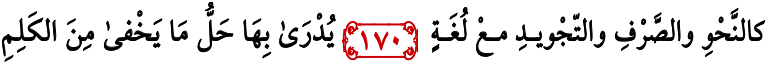 Syair 169: Ambilah (kalau kamu mau) apa yang kamu pakai sebagai bantuan dari ilmu-ilmu alat, maka kamu akan dapatkan ilmu alat itu sebagai solusi untuk hal yang tidak jelas. Contoh ilmu alat: nahwu, tasrif, tajwid, dan bahasa.