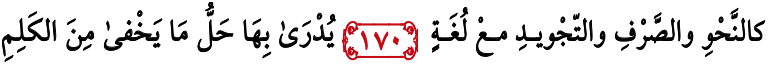 Syair 169: Ambilah (kalau kamu mau) apa yang kamu pakai sebagai bantuan dari ilmu-ilmu alat, maka kamu akan dapatkan ilmu alat itu sebagai solusi untuk hal yang tidak jelas. Contoh ilmu alat: nahwu, tasrif, tajwid, dan bahasa.