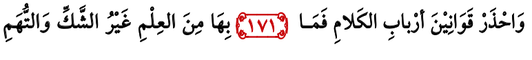 Bait syair 171: Hati-hati kamu wahai penuntut ilmu dari aturan-aturan tokoh-tokoh ilmu kalam. Kaidah mereka tidak ada dalam ilmu, kecuali ragu dan menunduh sembarangan. Ragu mendatangkan Tuhan. Hal ini yang membuat agamanya dicurigai.