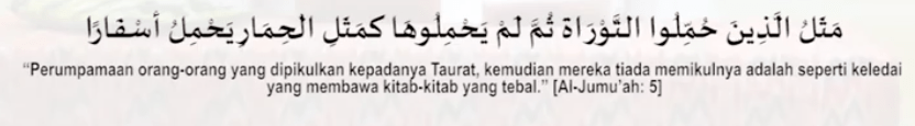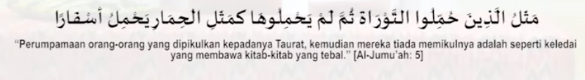 Keledai yang membawa buku-buku diatasnya, dia tidak paham buku yang dibawa. Seperti sebagian orang kemana-mana membawa kitab yang ingin menunjukan bahwa dia seorang yang berilmu. Sebagaimana firman Allah Ta’ala:
