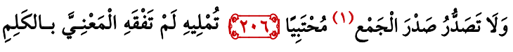 Syair 206: Ilmu itu bukan berada didepan perkumpulan dengan duduk ihtiba (duduk serius untuk mengajar dengan ditahan tangan atau sarung menahan kakinya). Yang dimana kamu memberikan ilmu tetapi dia sendiri tidak memahami makna ucapan.