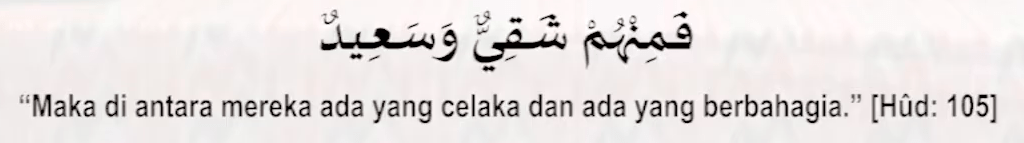 Kesengsaraan dan kebahagiaan semuanya ditangan Allah Subhanahu Wa Ta’ala. Penuntut ilmu harus memperhatikan hal ini. Karena pengaruh ilmu adalah menjadikan keimanan kepada Allah kuat. Setiap orang sudah ditetapkan siapa yang beruntung dan siapa yang merugi. Kehidupan diakhirat sudah dibagi menjadi dua juga. Sebagaimana firman Allah: