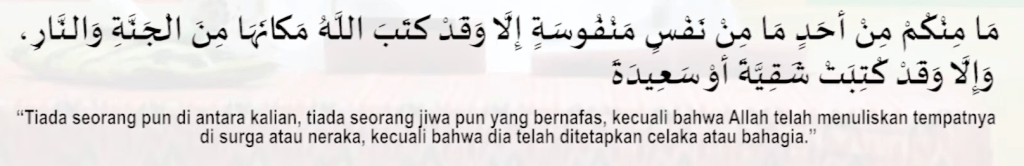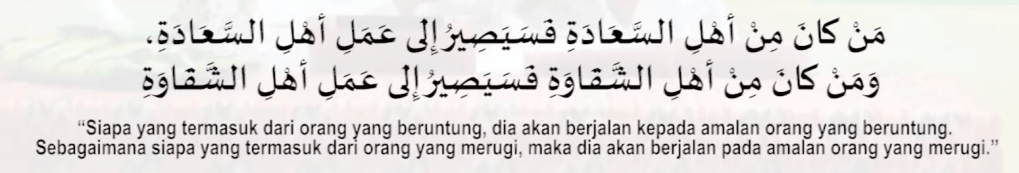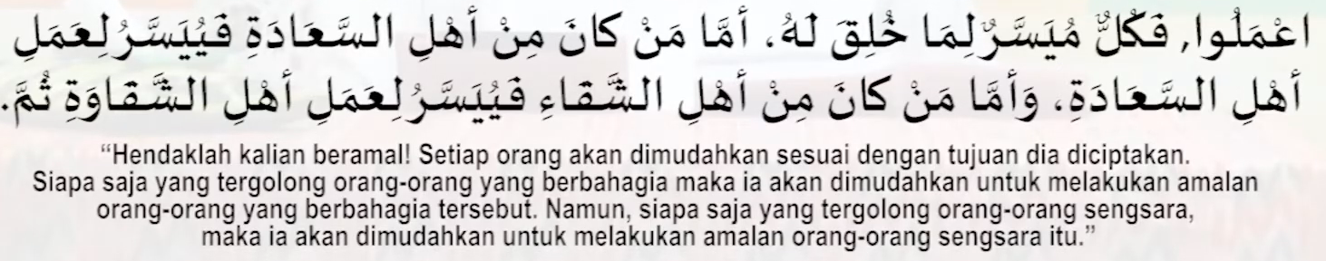 Kemudian seorang laki-laki berkata “Tidak lah kalo begitu, kita terima saja ketentuan Nya, dan kita tidak usah beramal?”. Rasulullah shalallahu alaihi wasallam bersabda: