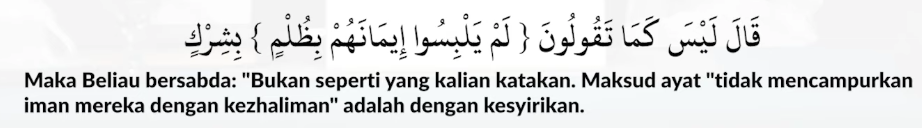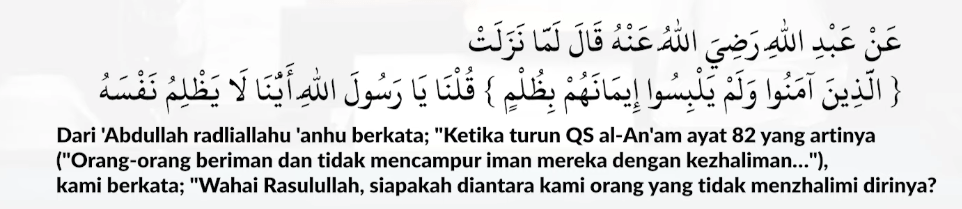 Dari Abdullah bin Mas’ud radhiallahu anhu, beliau berkata “Tatkala (Al-An’am ayat 82) turun, kami bertanya, ‘Wahai Rasulullah, siapa di antara kami yang tidak menzhalimi dirinya?’ Beliau bersabda “Ayat itu bukanlah sebagaimana perkataan kalian, melainkan bahwa “tidak mencampuradukan keimanan mereka dengan kezhaliman” (yaitu) kesyirikan. Tidaklah kalian mendengar ucapan Luqman kepada anaknya “Wahai anaku, janganlah engkau berbuat kesyirikan (karena) kesyirikan adalah kezhaliman yang terbesar”