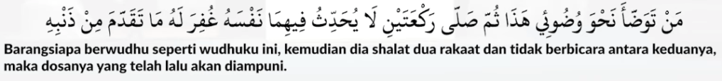 Sama halnya dalam hadist Ustman bin Affan, Nabi mengajarkan berwudhu yaitu dengan memperagakan bagaimana berwudhu yaitu dari cuci telapak tangan sampai kaki. Setelah Nabi menjelaskan hukum dan tata cara berwudhu, baru Nabi menjelaskan keutamannya pengampunan dosa.