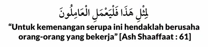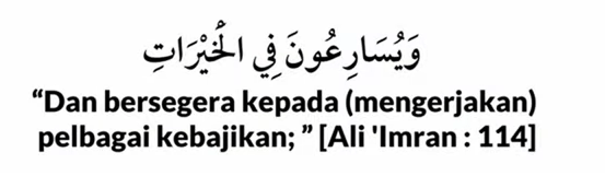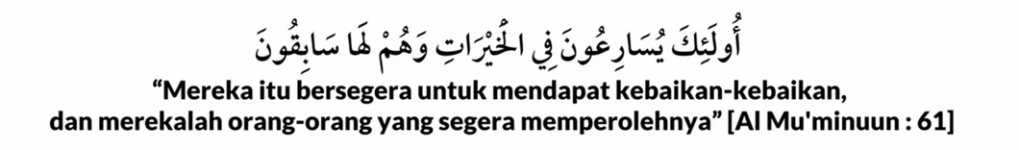 Perumpamaan: Aabila dimesjid disiapkan batangan emas, kemudian diambil kesempatan 10 menit untuk mengambil emas tersebut. Apa yang kita lakukan? Apabila dilakukan dengan segera maka akan banyak yang bisa di ambil. Akan tetapi bila 5 menit pertama duduk-duduk dulu bersantai maka tidak akan banyak yang bisa diambil.